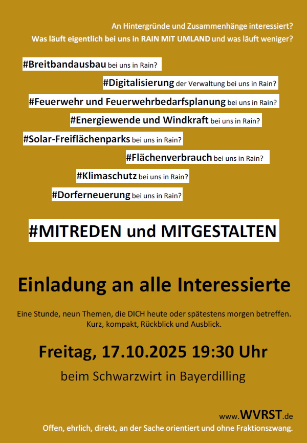 Am 17.10.2025 informierten wir als WVRST öffentlich, offen, ehrlich, direkt und an der Sache orientiert über Sachverhalte und Hintergründe, die DICH und DEINE GEMEINDE täglich betreffen. Ohne Fraktionszwang.