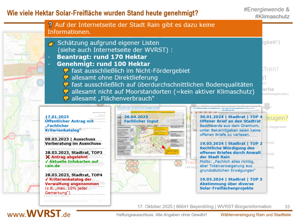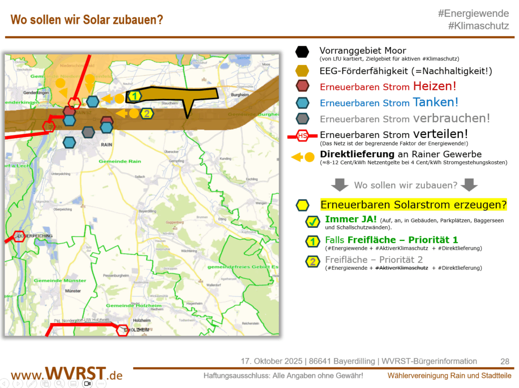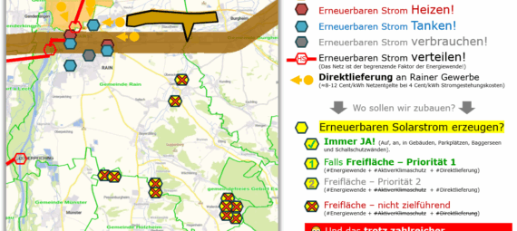 - Für das Stadtgebiet Rain mit rund 7.700 Hektar und 0,02% der Bundesfläche entspräche das rechnerische Ausbauziel für Solaranlagen 86 Megawatt.